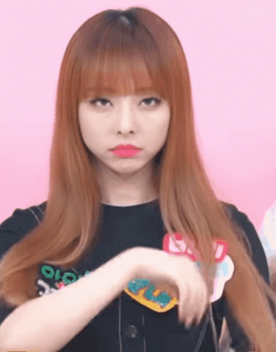 Loona's Vivi pouting with her arms crossed, wearing a black top with Korean text on a pink background.