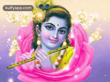Animated depiction of Lord Krishna playing a flute, emerging from a vibrant pink lotus flower.
