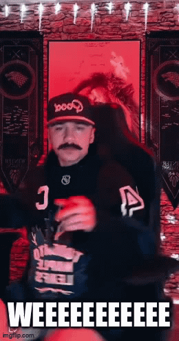 Lord Punchy Punchy, a man with a mustache and cap, spins enthusiastically in his gaming chair.