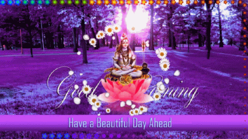 Lord Shiva on a lotus with a 'Good Morning, Have a Beautiful Day Ahead' message in a vibrant purple forest.