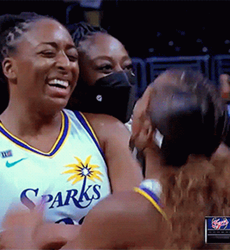 Los Angeles Sparks players Chiney Ogwumike and Nneka Ogwumike share a joyful hug on the court.