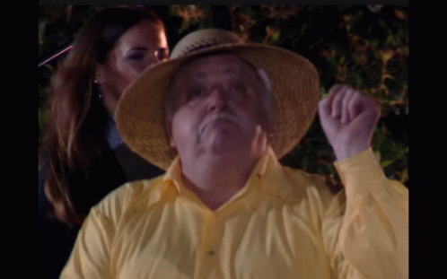 A man from Los Simuladores, wearing a yellow shirt and straw hat, reacts with a smile and raised fist.