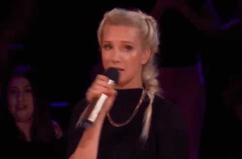 Heather makes a 'loser' gesture while holding a microphone and performing for a crowd.