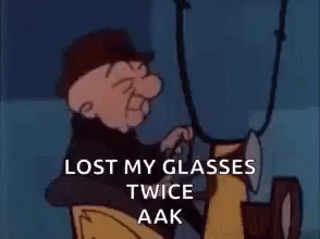 Mr. Magoo frantically drives his car, shouting 'Lost my glasses twice AAK' as he navigates a train track.