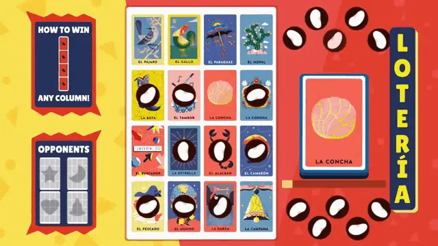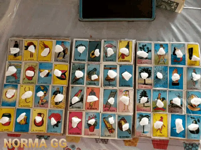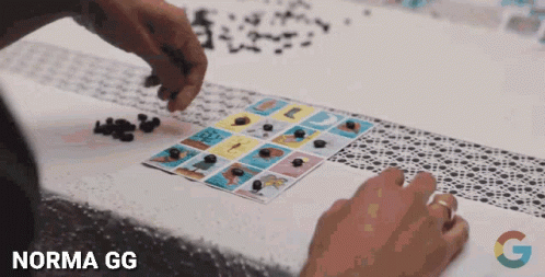 A person plays the traditional Mexican Loteria game, placing beans on their card on a white table.
