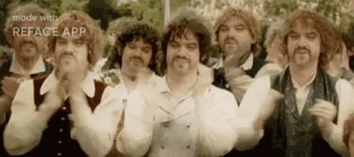 Lotr character Samwise Gamgee and a group of men clapping enthusiastically.