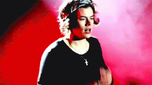 Harry Styles on stage, making a whistling gesture and singing, wearing a black shirt and cross necklace.