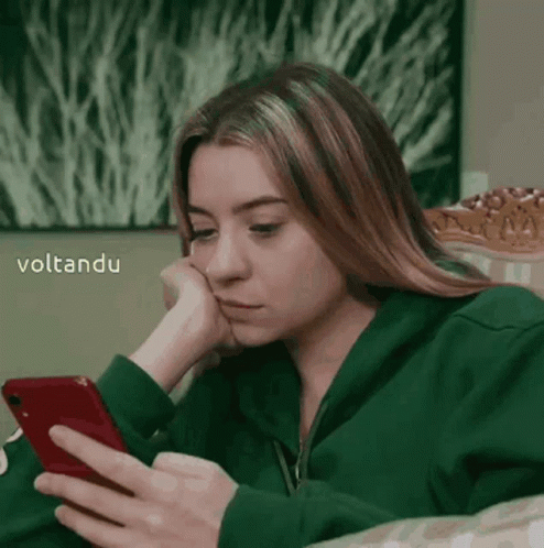 Loud Voltan, wearing a green jacket, engrossed in her phone, possibly feeling bored.
