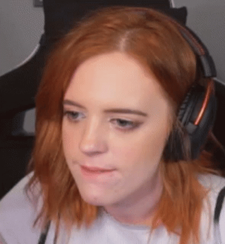 Louiseyhannah, a woman with red hair, reacts with a 'toxic' scrunched-up face while wearing headphones.