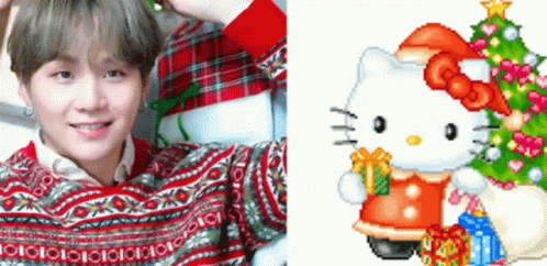BTS member Yoongi, also known as Lil Meow Meow, smiles in a Christmas sweater next to Hello Kitty pixel art.