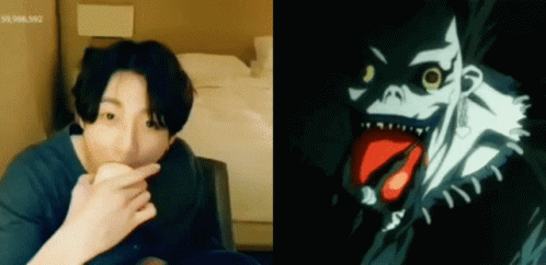 Jungkook from BTS is seen eating on one side, while Ryuk from Death Note holds an apple on the other, in this Lov4hob Bts Anime mashup.