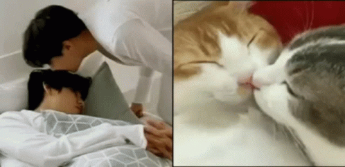 Lov4hob Vhope Kiss and Hobi Kiss shown alongside two cats affectionately licking each other.