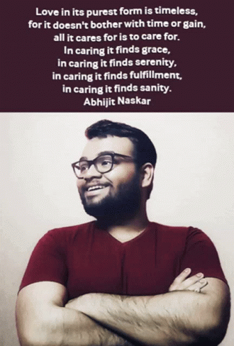 Abhijit Naskar smiles with arms crossed, accompanied by his profound quote on the timeless nature of love and caring.