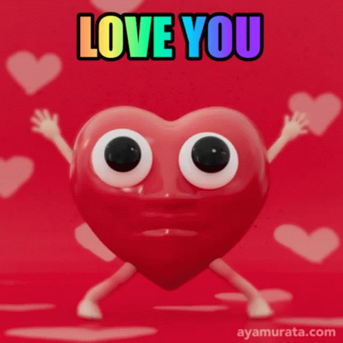 An animated red heart character with big eyes and limbs dances with 'LOVE YOU' text on a vibrant red background.