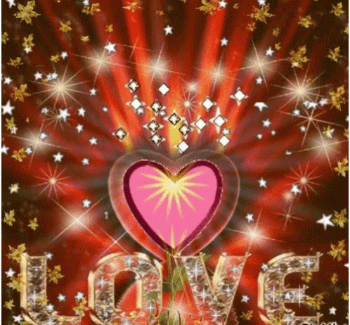 A vibrant animated graphic featuring a sparkling heart, the word 'LOVE', and golden leaves, associated with Bahonon.