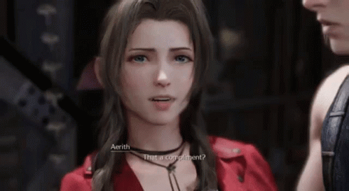 Cloud Strife and Aerith Gainsborough share a tender moment in Final Fantasy VII Remake, with playful dialogue.