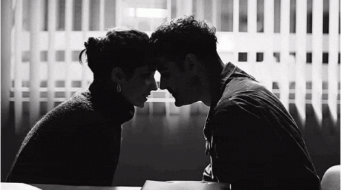 Meriç Aral and Burak Sevinç share an intense, emotional moment, touching foreheads in a black and white scene.