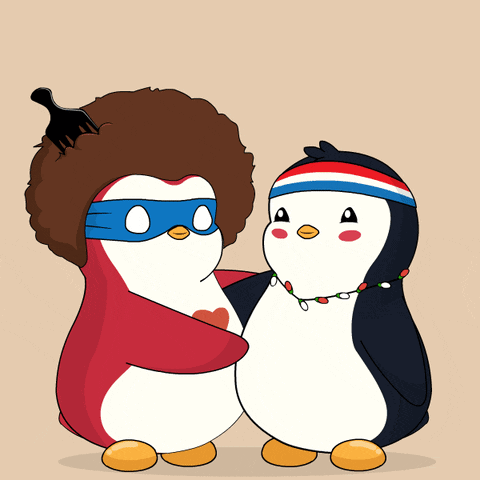 Two adorable penguins, one with an afro and mask, the other with a headband and lights, share a loving hug with a 'Thank You' message.