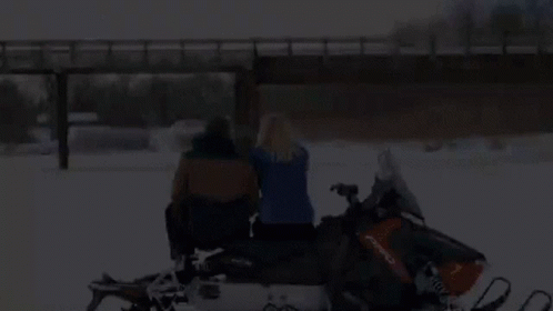 Jessy Schram and Marshall Williams share a happy moment on a snowmobile in a beautiful snowy landscape.