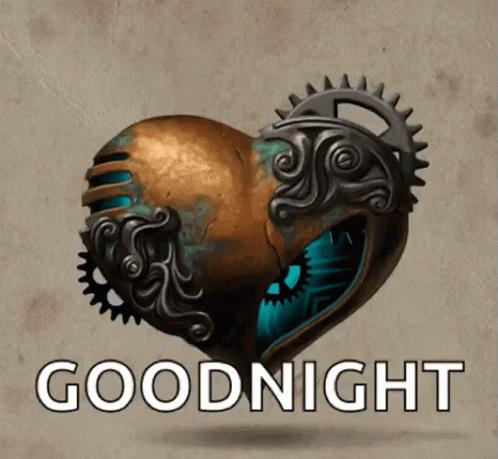 A stylized steampunk heart made of metal and gears, with the word 'GOODNIGHT' displayed below it.