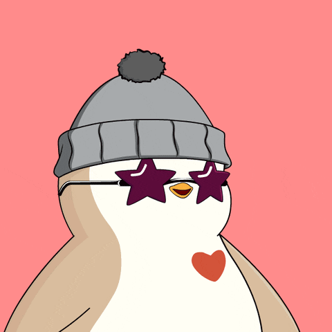 A pudgy penguin wearing a beanie and star-shaped glasses, with its eyes turning into hearts, showing love.
