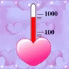 A pink heart with a love thermometer showing high levels of affection, set against a purple background.