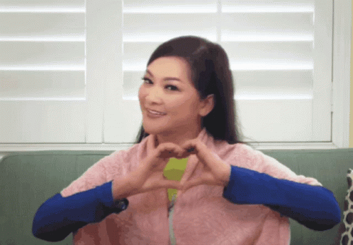 NhưQuỳnh smiles warmly at the camera while making a heart gesture with her hands, sitting on a green couch.