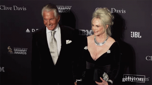 George Hamilton and Kelly Day smiling happily on the red carpet at the Grammy Awards.
