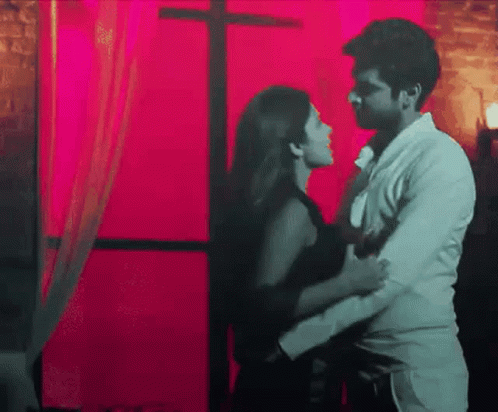 Maya and Rudra share a passionate, romantic kiss, embracing each other in a dimly lit room with a vibrant red background.
