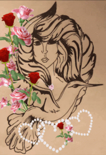 A beautiful drawing featuring a woman, a hummingbird, roses, and pearl hearts, symbolizing love and wedding themes.