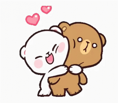 Milk and Mocha bears share a loving hug with hearts floating around them.