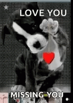 A cute black and white puppy with a red heart on its chest holds a flower, expressing 'Love You Missing You'.