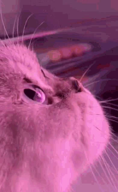 A close-up of a lovely kitty's face, illuminated by pink light, showing its captivating eyes dilating.