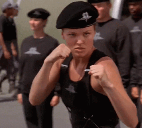 Dina Meyer as Dizzy Flores in Starship Troopers, ready for action in a fighting stance with fists clenched.