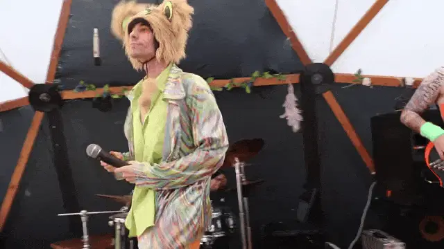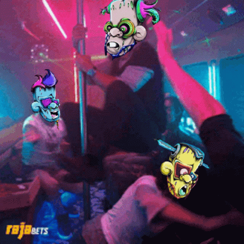 A vibrant rave scene featuring LTA NFT, Kozmonauts, and Luca, with neon lights and people dancing.