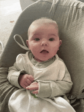Adorable baby Lua May sitting in a gray chair, smiling and sticking out her tongue.