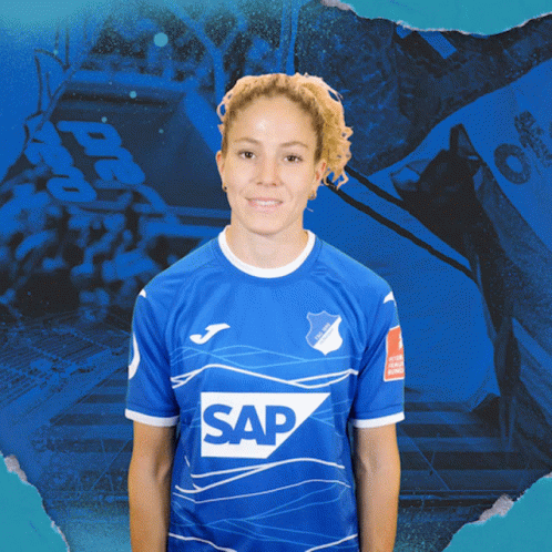 Luana Bühler of TSG Hoffenheim celebrates with excitement, wearing her team's blue jersey.