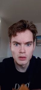 Luc, wearing a black 'DAILY' shirt, eats a stroopwafel, then stares intensely and places it on his forehead, appearing to sweat.
