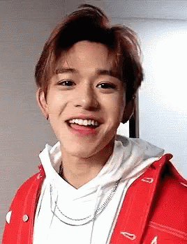Lucas from NCT smiles brightly, wearing a red jacket and white hoodie, looking cheerful.