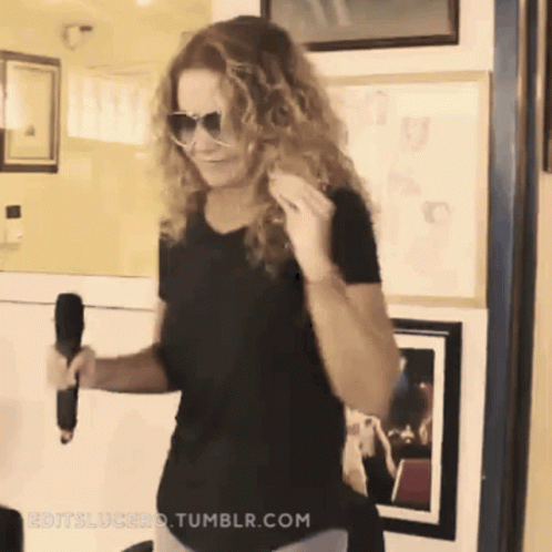 Lucero, wearing sunglasses and a black shirt, energetically dances while holding a microphone, showcasing her moves.