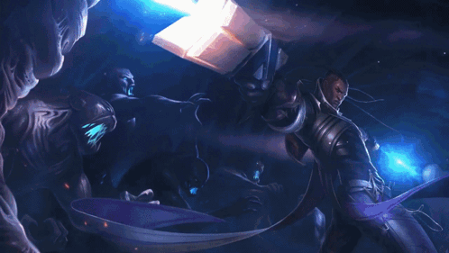 Lucian, the Purifier, battles shadowy figures in a dynamic League of Legends splash art scene.