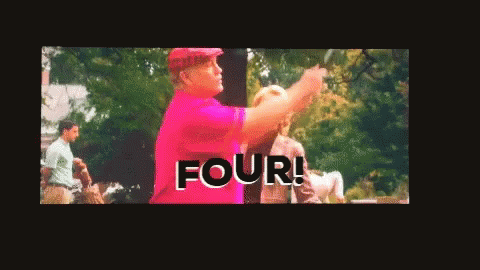 Lucien Lauren shouts 'FOUR!' on a golf course, warning others of a potential accident.