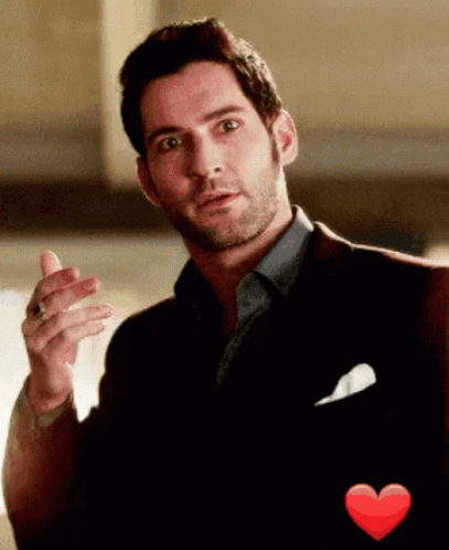 Lucifer Morningstar (Tom Allen) points confidently at the viewer, accompanied by a red heart emoji.