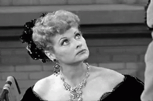 Lucille Ball, wearing a glamorous necklace and earrings, playfully sticks her tongue out and looks up.