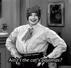 Lucy Ricardo from I Love Lucy, confidently asking 'Ain't I the cat's pajamas?' in a classic black and white scene.