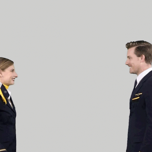 Lufthansa flight attendants, a man and a woman, share a high five and smile at the camera.