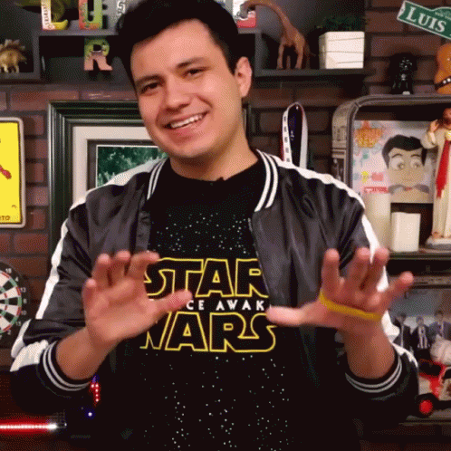 Luisito Rey smiling and gesturing to calm down, wearing a Star Wars shirt.