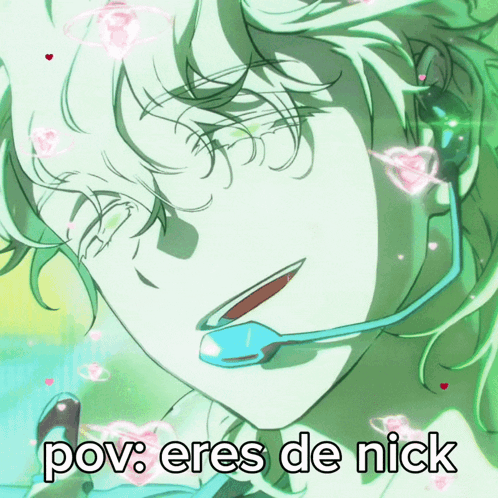 Luka from Alien Stage with hearts and glowing effects, captioned 'pov: eres de nick'.