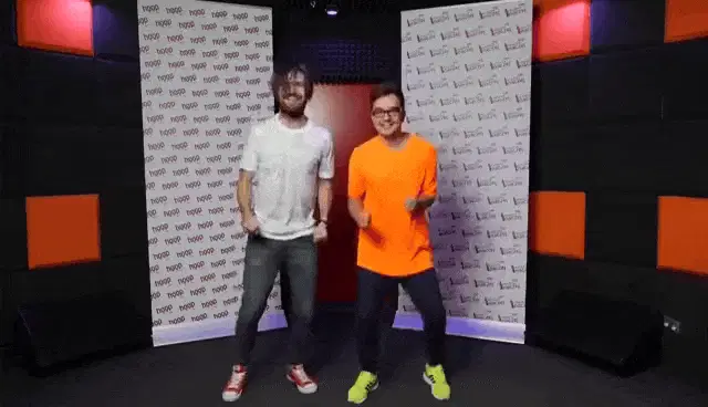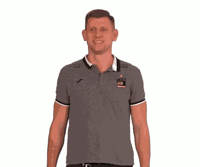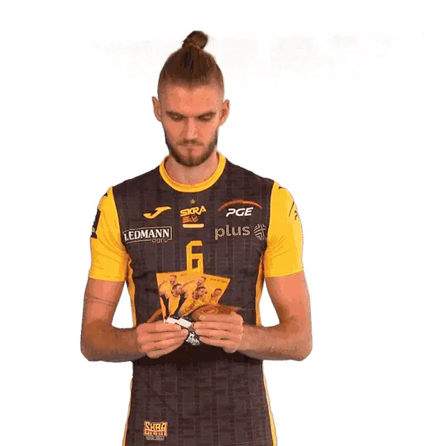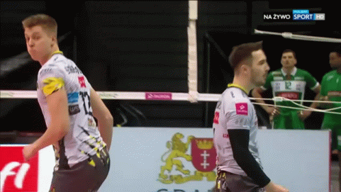 Lukasz Kozub of Trefl Gdansk celebrates a point with a high five during a volleyball match.