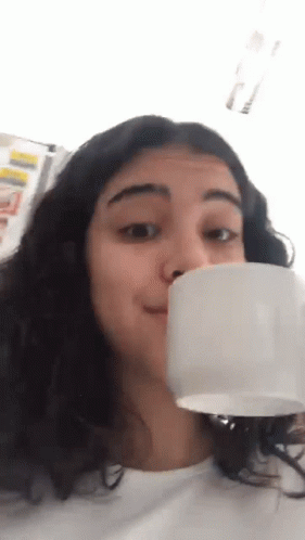 Luliza Marmita sips from a white mug and then makes a playful, silly face directly at the camera.